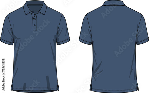 Navy blue short sleeve polo shirt front and back view vector illustration, classic collar fashion apparel design for clothing catalog