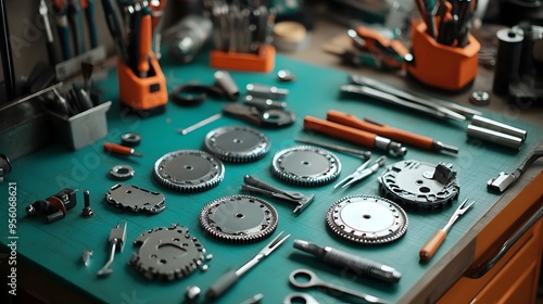 Neatly Arranged Motorcycle Clutch Plates on Illuminated Workbench