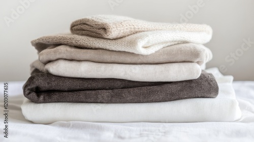 Neatly folded stack of soft, neutral-toned blankets arranged on a light surface