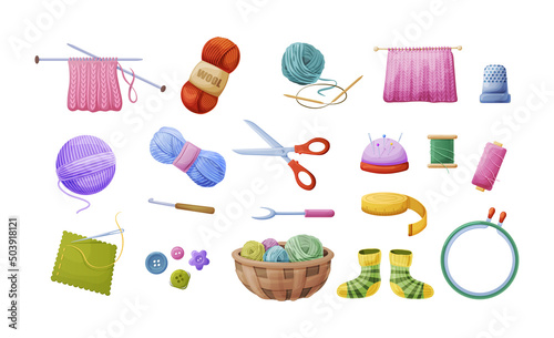 Needlework tools set. Supplies for craft hobby sewing, knitting, embroidery.
