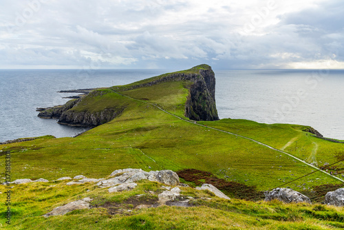 Neist Point at sunset is a breathtaking sight—its lighthouse stands against dramatic cliffs, with waves crashing below. A rainbow arches over the ocean, painting the rugged Isle of Skye magical light