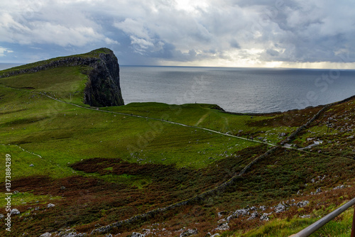 Neist Point at sunset is a breathtaking sight—its lighthouse stands against dramatic cliffs, with waves crashing below. A rainbow arches over the ocean, painting the rugged Isle of Skye magical light