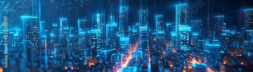 Neon blue architecture in a digital city, presenting a network of interconnected buildings in a modern urban planning simulation