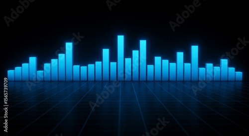 Neon blue equalizer bars graphic, digital audio spectrum display, sound wave visualization