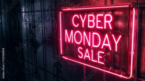Neon Cyber Monday Sale text, set against a dark metal background. Modern 3D banner template design with neon bright lights