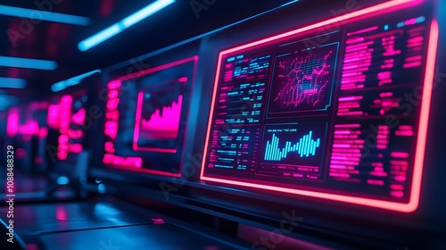 Neon Data Center Monitors Displaying Stock Market Data