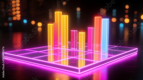 Neon glowing bars chart on a reflective surface at night.