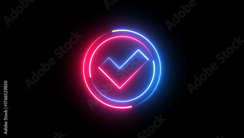 Neon glowing blue and pink Check Mark icon. Verify check icon on black background.