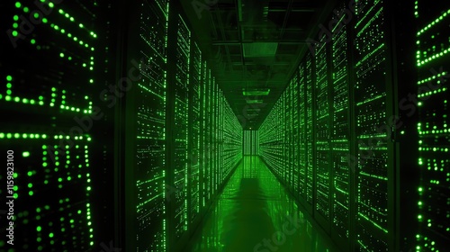 Neon Green Server Room with Lights Reflecting on Floor and Walls