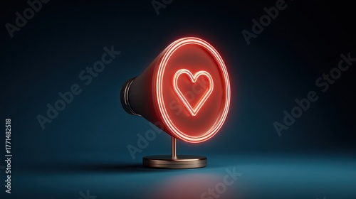 Neon heart symbol within megaphone against dark blue background