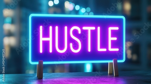 Neon Hustle Sign Glowing Brightly in a Modern Urban Space Representing Hard Work Concept