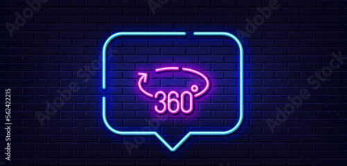 Neon light speech bubble. 360 degrees line icon. VR simulation sign. Panoramic view symbol. Neon light background. 360 degrees glow line. Brick wall banner. Vector