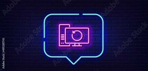 Neon light speech bubble. Recovery computer line icon. Backup data sign. Restore information symbol. Neon light background. Recovery computer glow line. Brick wall banner. Vector