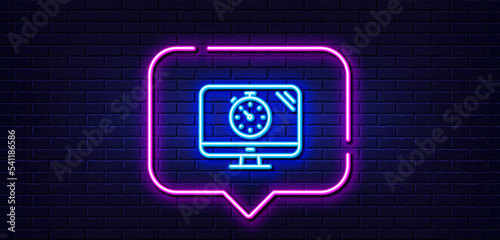 Neon light speech bubble. Seo timer line icon. Search engine optimization sign. Analytics symbol. Neon light background. Seo timer glow line. Brick wall banner. Vector