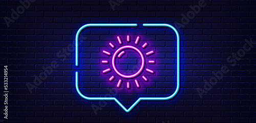 Neon light speech bubble. Sun energy line icon. Solar sign. Ecology power symbol. Neon light background. Sun energy glow line. Brick wall banner. Vector
