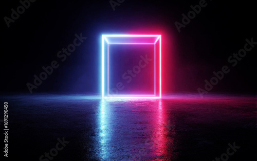 Neon lit square frame with vibrant red and blue lights in dark setting