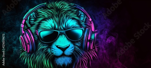 Neon Party Animal Cool DJ Lion Wearing Headphones and Sunglasses, Digital Art Illustration