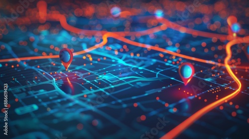 Neon Route Map with Glowing GPS Markers and Pathways