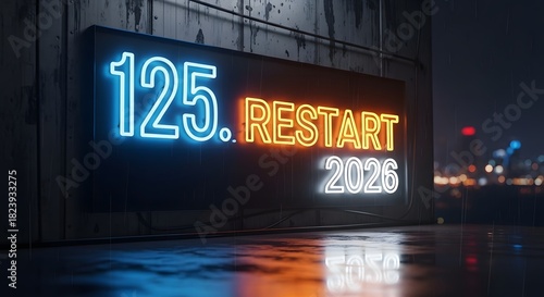 Neon sign displaying 125 restart 2026 at night with city background