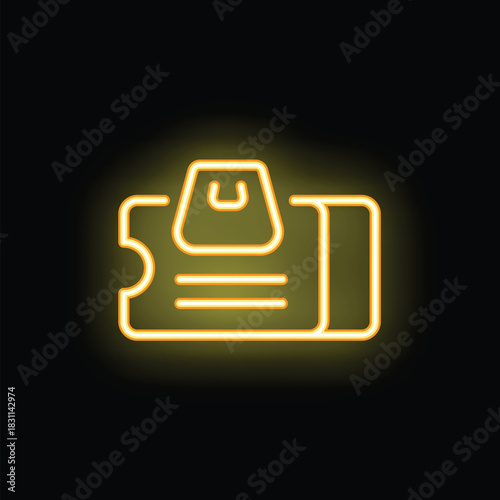 Neon yellow shopping discount coupon icon glowing on black background
