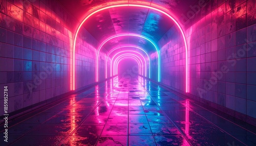 Neon-lit corridor with reflections on wet tiles