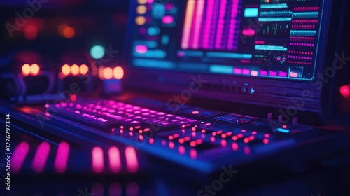 Neon-lit gaming setup, futuristic interface, night background, for tech articles