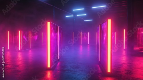 Neon-lit hallway with vibrant pink and blue hues