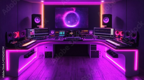 Neon-lit studio; music production; cosmic backdrop; mixing console
