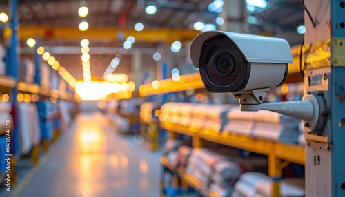 Neon-Lit Textile Warehouse with Security Cameras at Golden Hour