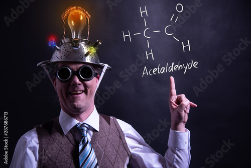 Nerd presenting handdrawn chemical formula of acetaldehyde molecule