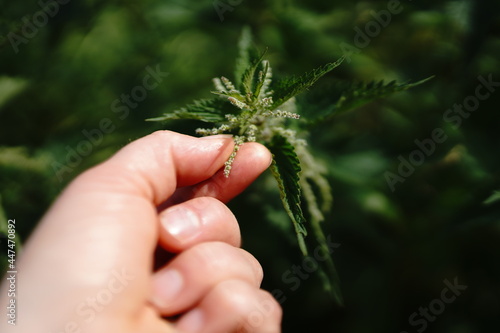 Nettle seed close up in a female caucasian hand