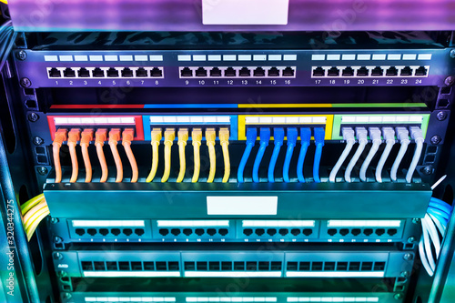 network cable connecting on network core switch close up