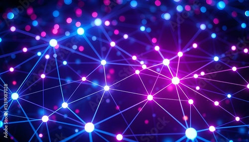 Network connections, glowing nodes, futuristic technology, abstract digital landscape, neon blue and pink lights, interconnected web, data visualization