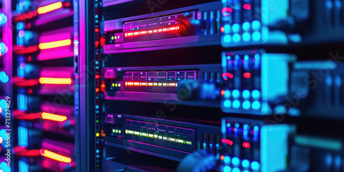 Network Server Room with Racks. Closeup wallpaper of Blurred servers in data center with blue lights.