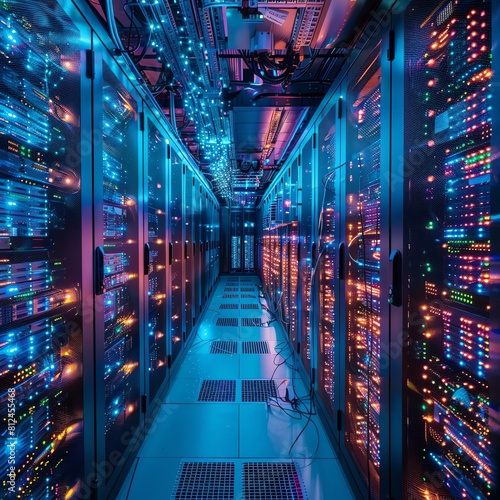 Networking infrastructure, wideangle, rack cabinets under LED glow, soft light, connected technology essence