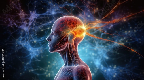 Neuronal Brain network featuring neurons, synapses, vital brain regions like thalamus, hypothalamus, and brainstem. Neural plasticity, neurogenesis, connectome with white and gray matter to CNS