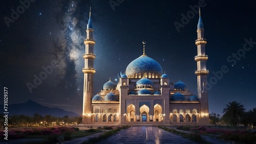 New Eid al-Fitr Celebration: Mosque Glowing under Starry Night Sky with Crescent Moon Background