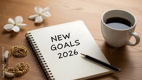 New Goals 2026 written on a spiral notebook with a pen coffee and flowers on a wooden table.