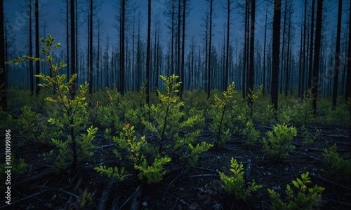 New life emerges in a forest after a wildfire, with young saplings pushing through the charred ground