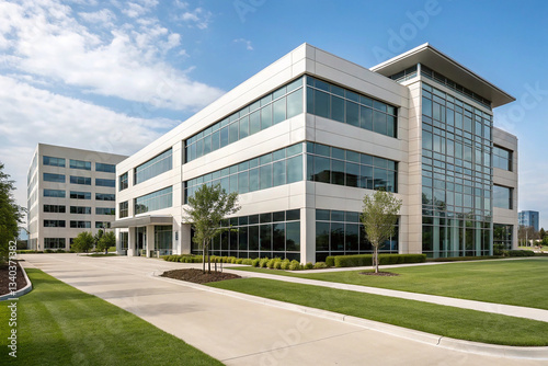 New modern corporate office building exterior. Exterior of modern corporate office building in office park.
