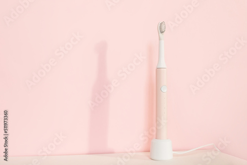 New modern ultrasonic toothbrush. Jaw model and dental care supplies on pink pastel background. Oral hygiene, dental and gum health, healthy teeth. Dental products Ultrasonic vibration toothbrush.