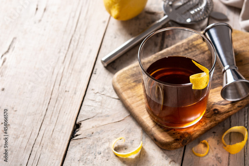 New Orleans sazerac cocktail on rustic wooden table.Copy space