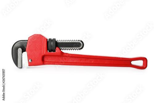 New pipe wrench on white background. Construction tool
