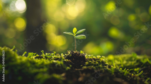 New plant seedling emerging in mossy forest