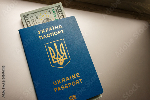 New Ukrainian blue International biometric passport with an identification chip with American banknotes inside on the gray background.