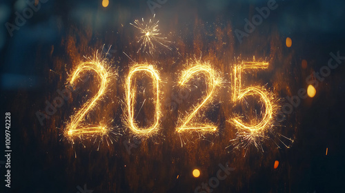 New Year 2025 festive background the numbers 2025 surrounded by vibrant fireworks, bokeh lights, sparkling confetti, and glittering ornaments, creating a lively poster atmosphere for celebration