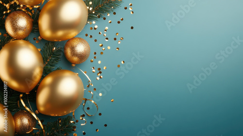 New Year Celebration Banner, 2025 golden balloons, shimmering branches, vibrant blue backdrop, festive atmosphere, ideal for seasonal greetings