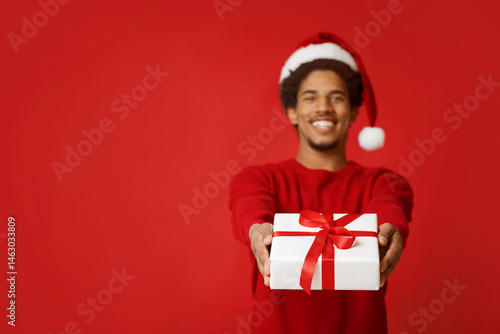 New Year presents and winter holidays. Focus on box with gift with ribbon in hands of african american man in sweater and santa claus hat, isolated on red background, copy space, studio shot