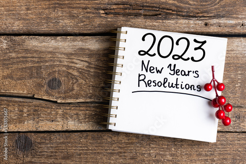 New year resolutions 2023 on desk. 2023 resolutions list with notebook, coffee cup, decorations on table. Goals, resolutions, plan, to do list, action concept. New Year 2023 background. Copy space