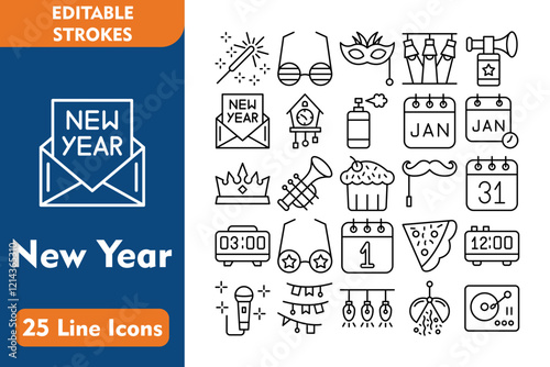 New Year's 25 Line Icon Set Included Icons sparkler, fun glasses, eye mask, spotlight, air horn, card, cuckoo clock